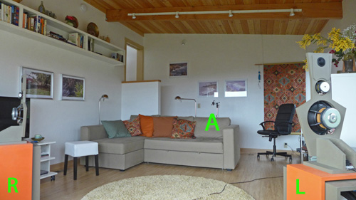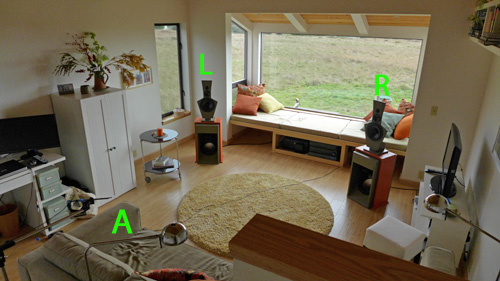Sea Pine Cottage vista-room with LX521 loudspeakersThe room was added to our Sea Pine Cottage at The Sea Ranch as part of a remodel. It has the maximum volume and floor size that was permitted. I had wished for greater height and greater distance to the wall behind the listening position. As it turned out the LX521 performs to great satisfaction in this room. Compared to the CM living room the auditory scene feels more intimate. Speakers and room disappear and the tonal balance is the same as in the larger room. Bass frequencies are powerful but maybe not quite as much as in CM. I need to spend more time listening to a variety of music. So far the watched many movies on the tV screen that can be placed between the speakers. I am often amazed by the realism of the venue sounds and the acoustic atmosphere in movies. It will be interesting to analyze the room data and compare them to the CM living room.