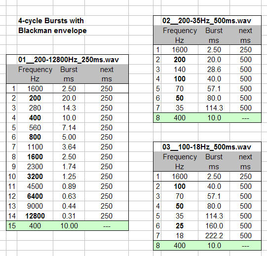 The burst sequences were constructed using the Expression Evaluator and Copy and Paste functions in GoldWave. Frequencies in File-01 cover the reverberant frequency range above the Schroeder frequency of typical listening rooms. It is also the range where maximum volume can be obtained from a typical loudspeaker for higher signal to noise ratio of the test. Table 1.