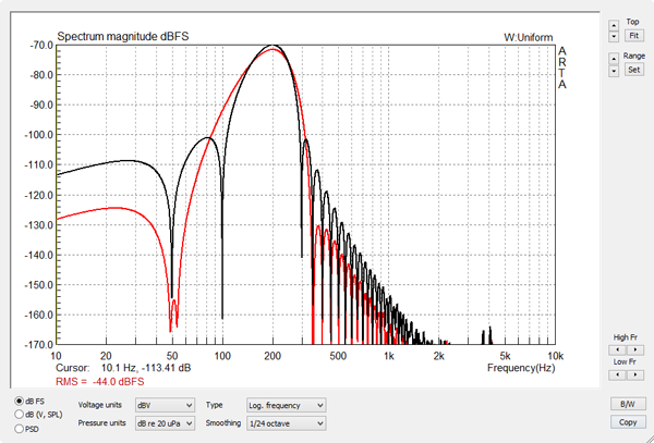 A 4-cycle burst with a Blackman envelope is described in the GoldWave Expression Evaluator by: 0.95*((0.42-0.5*cos(pi*(f)/2*(t-(4/f)))+0.08*cos(pi*(f)*(t-(4/f)))) A 4-cycle burst with a Cosine envelope is described in the GoldWave Expression Evaluator by: 0.95*((0.5-0.5*cos(2*pi*t*f/x))*sin(2*pi*t*f))*(step(t)-step(t-(x/f))) The Blackman burst (red) has higher out-of-band attenuation, which gives useful dynamic range for 2nd and higher harmonic measurements. |