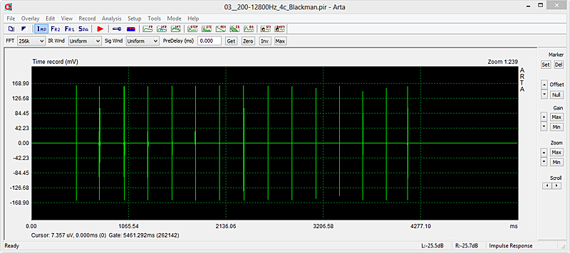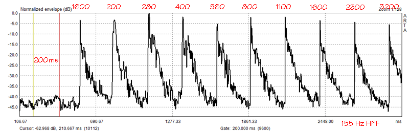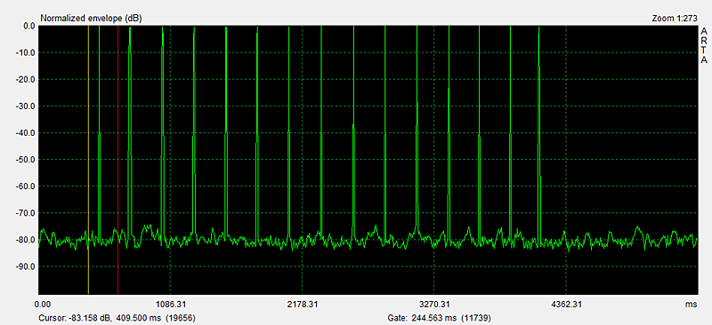 Download Burst files: Play the files in Repeat mode. Push Record in the ARTA Signal Recording window when you hear the 400 Hz burst at the end of a burst sequence. For practice, download and open with ARTA the "impulse response" file, which was used for the above graphics: |