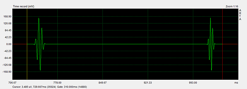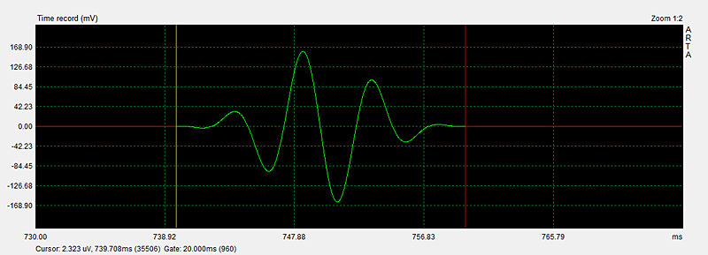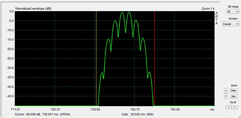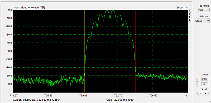 After the recording has ended push the Zoom Min button to to see the burst response. Using Cursor and Gate markers (left and right mouse buttons) identify the burst to zoom in on by stepping up Zoom Max. The visual dynamic range of the linear amplitude display is not very large and also confused by seeing a positive and negative going signal. Much greater range is obtained by taking the absolute level of the burst wave (= full-wave rectification) and displaying the result on a logarithmic amplitude scale. In ARTA this is accomplished by selecting the ETC mode with a causal window. Again, the Zoom Min button has to be pushed to see the signal as in Figure 7.