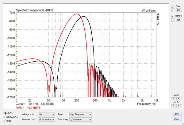 The effectiveness of the filter is visible in the wave form of the burst ETC taken in my small office room. The highpass filter was used in Figure 11, but not in Figure 12. You can compare the two files in more detail using ARTA with office-hpf.pir and office-no-hpf.pir.