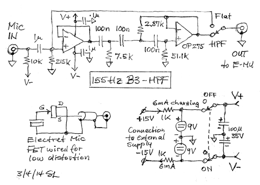 Ambient noise deteriorates the dynamic range of acoustic burst measurements. The time record is broadband and the ETC is not frequency selective. File 01 only consists of burst frequencies above 200 Hz. A 155 Hz 3rd-order Butterworth highpass filter after the microphone is effective in reducing low frequency rumble and 60 Hz hum from various machinery. The following circuitry also provides -9 V bias for the electret microphone capsule and is powered by rechargeable batteries.