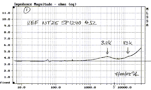 The impedance (1) of the tweeter shows a 3.2 kHz peak due to its mechanical resonance and a slight irregularity at 13 kHz. It can be expected that the frequency response rolls off at 12 dB/oct below the mechanical resonance as for any closed box dynamic driver.