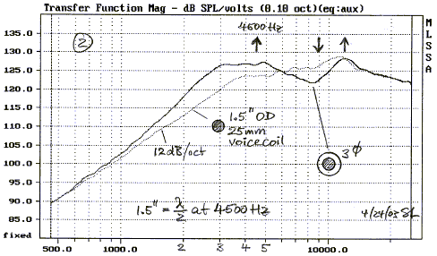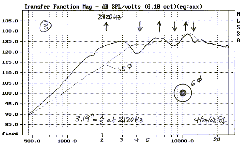 For a 3 inch circular baffle with a point source at its center there should be a 4.5 kHz peak, a 9 kHz dip, a 13,5 kHz peak, a 18 kHz dip and so on, whenever the edge is at multiples of a half wavelength from the source. Note that above about 14 kHz the baffle has no effect, because the dome has become too directional to illuminate the edge. The dome diameter becomes acoustically too large at higher frequencies to be considered a point source and the shape of the response ripples is smeared. Below 1000 Hz the baffle has decreasingly less effect. The source becomes omni-directional. With increasing frequency, though, the on-axis SPL of the 3" arrangement increases faster than for the bare tweeter. This is the so called "baffle step", where radiation contracts from 4p space to 2p space.