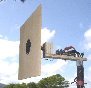 This roll-off behavior can be seen in the on-axis frequency response of the unbaffled driver (2). There is also a peak corresponding to the impedance irregularity at 13 kHz. The low frequency roll-off has no influence on the results of the following diffraction investigation since only the change in on-axis response due to the different baffles is of interest.