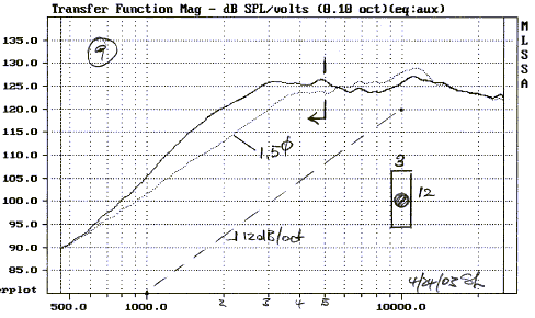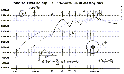 An increase in baffle diameter to 6" causes the baffle step to begin at half the frequency of the 3" baffle (3). The on-axis pressure increase due to diffraction can be up to 10 dB for a circular disc. This is approached at 2 kHz in (3) and at 1 kHz in (4) for the 12" disc. Note the increased number of peaks and dips as the baffle diameter is increased, and the peak to trough amplitude variation is not much different.