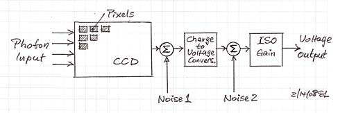 1 - CCD photo sensor noiseThe weak link in a compact digital camera in terms of image quality is usually the photo sensor. Its electronic circuits add noise to the voltage that has been generated from the accumulation of photons in the individual pixel elements of the sensor. The conversion of electrical charge into voltage is associated with some noise, as is the amplification of this voltage to obtain higher ISO settings and thus higher light sensitivity. The photon conversion and addition of noise is shown schematically in the block diagram.