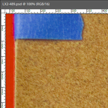 Lens sharpness comparisonThe lenses for the Lumix and Leica camera models that are investigated here have been manufactured by Panasonic. The question is about their specifications. Do the Leica models have lenses with tighter tolerances than the Lumix models? In some test shots I noticed that the Leica D-Lux 3 gave a blurrier picture at the edge than the Lumix LX2. The cameras were tripod mounted, no image stabilization, manual focus to infinity, 2 second shutter delay. So there was no motion blur. I took multiple landscape pictures with all four cameras. Their sharpness distribution over the picture area did not change significantly with focal length or aperture used. Seeing how the gravel roof also showed the lack of sharpness, I decided to take four close-up pictures of sand paper, one for each camera.