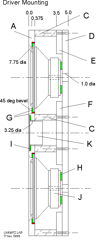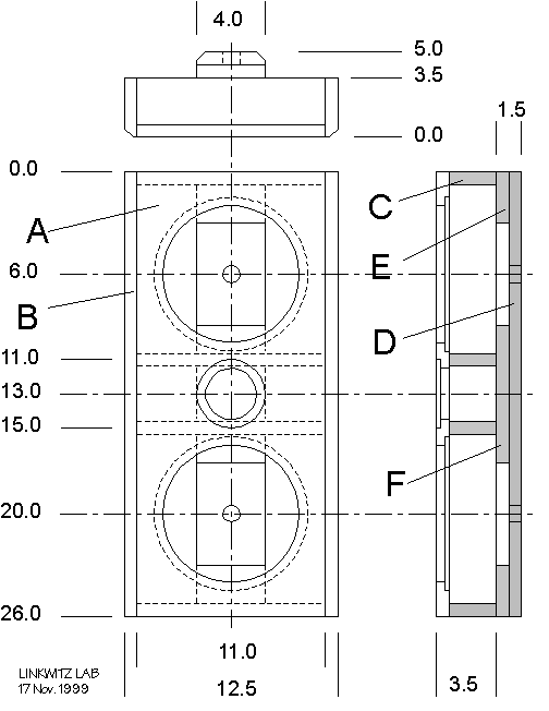 A - Front panel, 26" x 11", two 196 mm diameter holes with 450 bevel, and 228 mm diameter recess of 9 mm depth in rear, one 76 mm diameter hole with 106 mm diameter recess of 5 mm depth in front. Tweeter hole requires additional cutout for fitting the driver solder lugs.